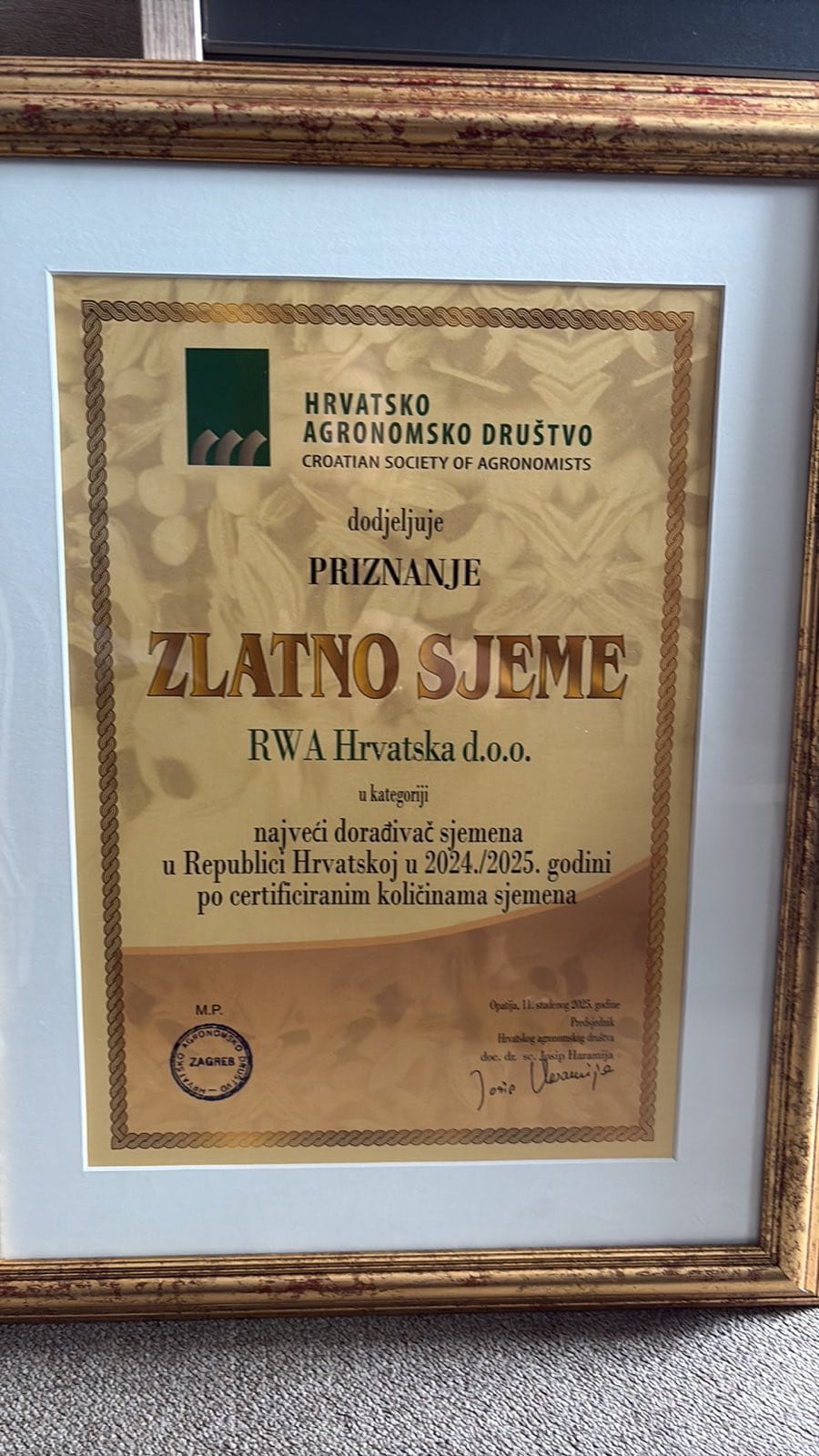 Na 18. Međunarodnom kongresu Oplemenjivanje bilja, sjemenarstva i rasadničarstva koji se upravo održava u Opatiji, primili smo priznanje za Najvećeg dorađivača sjemena u Republici Hrvatskoj. Priznanje našoj kolegici Sanji Vekić Poznić uručuje državni tajnik Tugomil Majdak.